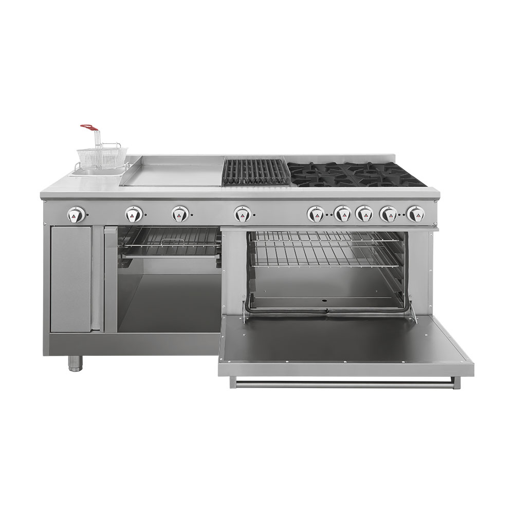 Estufa 4 quemadores con horno, plancha 2 pies, asador de 1 pie, freidora 5 lt. y gratinador. Fabricada en acero inoxidable con posterior en lámina aluminizada. Con parrillas y quemadores de hierro fundido. Estufa para profesionales de la cocina, con necesidades de eficiencia en la preparación de los alimentos. Medidas: 183 cm x 76.8 cm x 95 cm Peso: 195 Kgs..