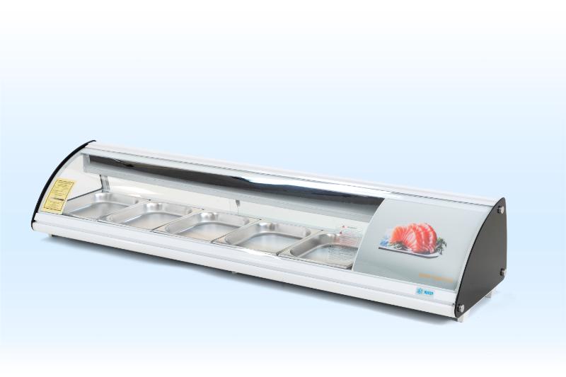 VITRINA REFRIGERADA PARA SUSHI MARCA MIGSA. SOBRE MOSTRADOR, COLOR BLANCO, TEMPERATURA DE REFRIGERACIÓN DE 0 A 12°C, CRISTAL CURVO, SERPENTÍN SUPERIOR Y PLACA FRÍA, ILUMINACIÓN CON LED, 120 V / 60 HZ. 5 CHAROLAS ASTRONORM DE 1/3. CAPACIDAD DE 52 L, POTENCIA DE 180 W, PESO NETO DE 38.5 KG. MEDIDAS: 135.2 X 42 X 26.5 CM