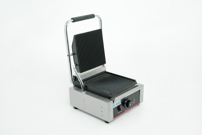 PLANCHA PANINI SENCILLA MARCA MIGSA. GABINETE EN ACERO INOXIDABLE CUBIERTA ACANALADA CON TEFLÓN, POTENCIA DE 1.8 KW A 120 V. TERMOSTATO DE 50 A 300 °C, LUZ INDICADORA Y RECOLECTOR DE GRASA. MEDIDAS: 31.4 X 30 X 20 M